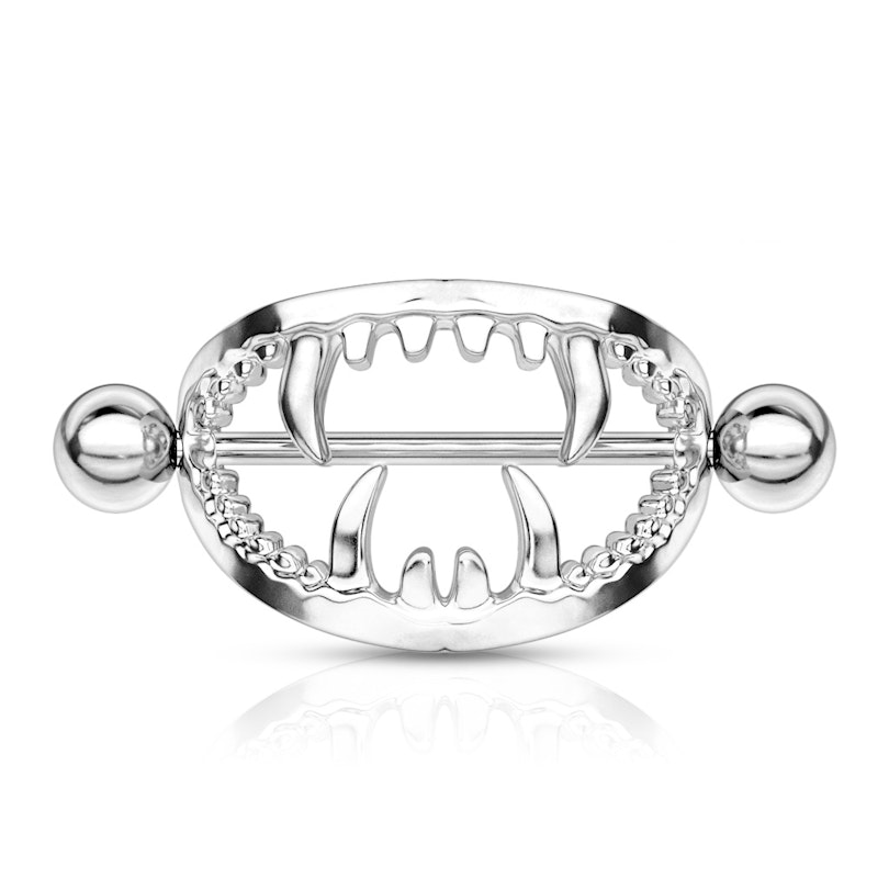 Tento piercing do bradavky je lákavé sousto. Skládá se z tyčinky, která je vyrobena z chirurgické oceli, která vede od jednoho okraje úst ke druhému, přes zuby a tesáky. Když si tento piercing nasadíte do bradavky, bude to vypadat, že je bradavka uvnitř úst.