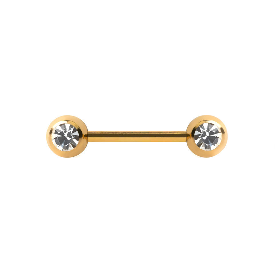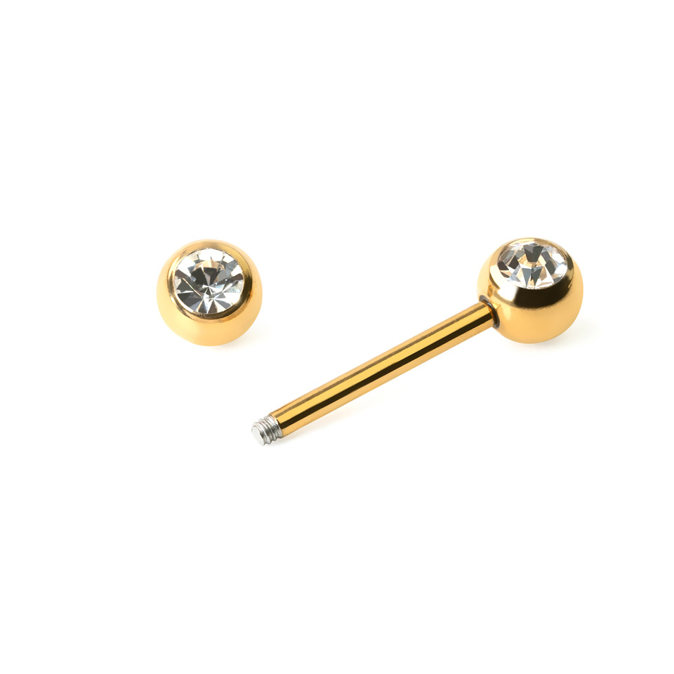 Piercing je zakončen 6mm velkou kuličkou na obou koncích. Nedá se říct, že se jedná o velmi diskrétní šperk, protože s ním na sebe rozhodně strhnete pozornost. Kromě barvy je speciální také svými kuličkami ozdobenými čirým kamínkem. Kamínky jsou kulaté a mají řez podobný diamantům, takže se budou nádherně třpytit.