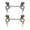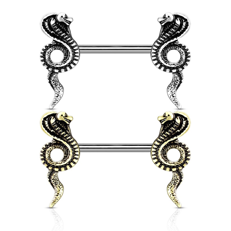Tato činka není jako běžné šperky. Klasické piercingy do bradavky se skládají z rovné činky a dvou koncových kuliček, ale kreativitě se meze nekladou. Tento šperk do bradavky je vyroben z chirurgické oceli a na každém konci má kobru. Ty jsou vyrobeny z mosazi a byly potaženy vrstvou stříbrné nebo zlaté barvy. Oba modely vám neskutečně ozdobí bradavku. Tento šperk je navržen pouze pro bradavky, takže není vhodný pro žádné jiné piercingy, ani pro jazyk.