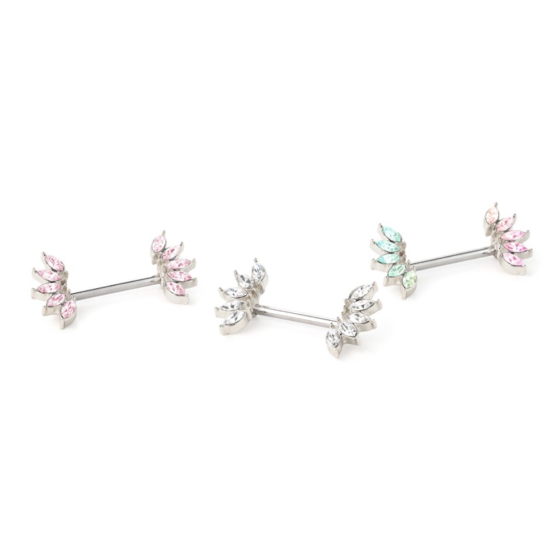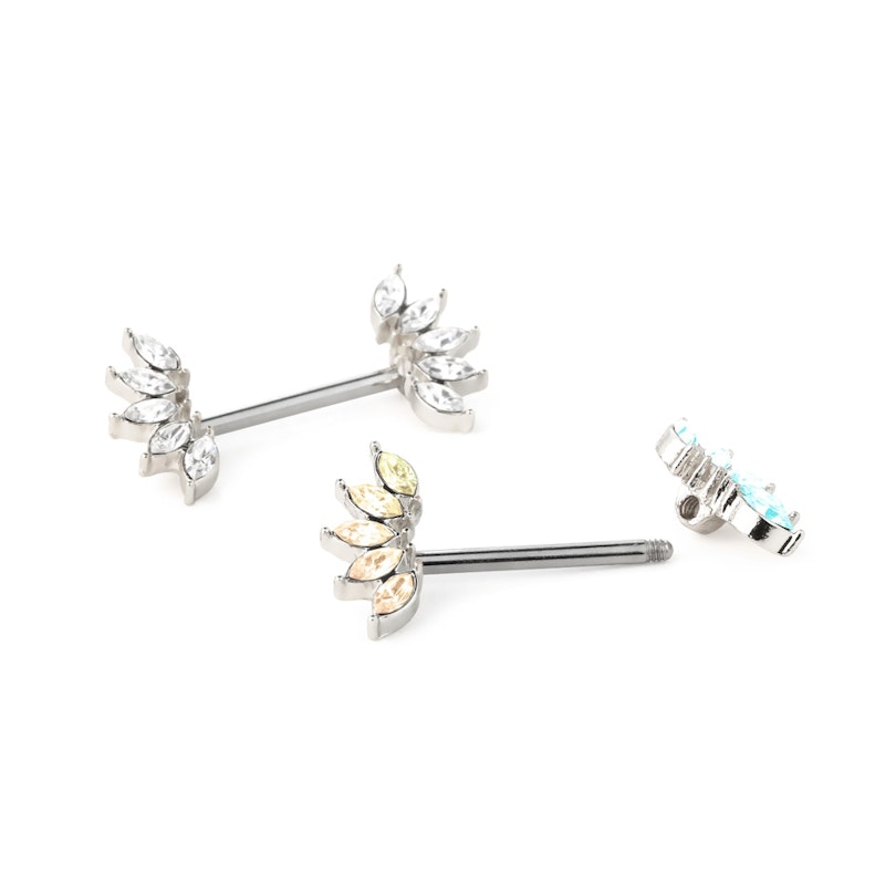 Tyto vějíře zdobí oba konce 16mm dlouhé tyčinky. Tyčinka je vyrobená z chirurgické oceli, zatímco zbytek šperku je z mosazi. Aby měla mosaz krásnou, lesklou barvu, byla potažená barevnou vrstvičkou rhodia.
