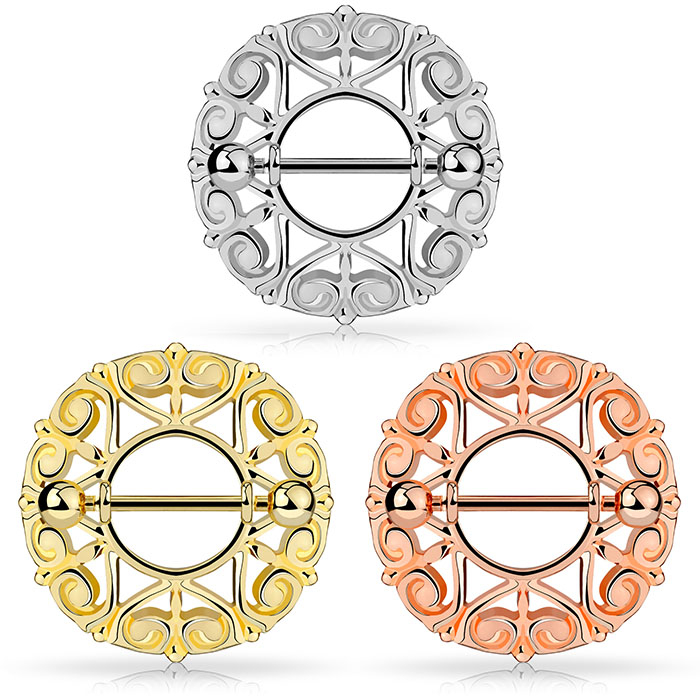 Piercing do bradavky se štítem s filigránem ze srdíček