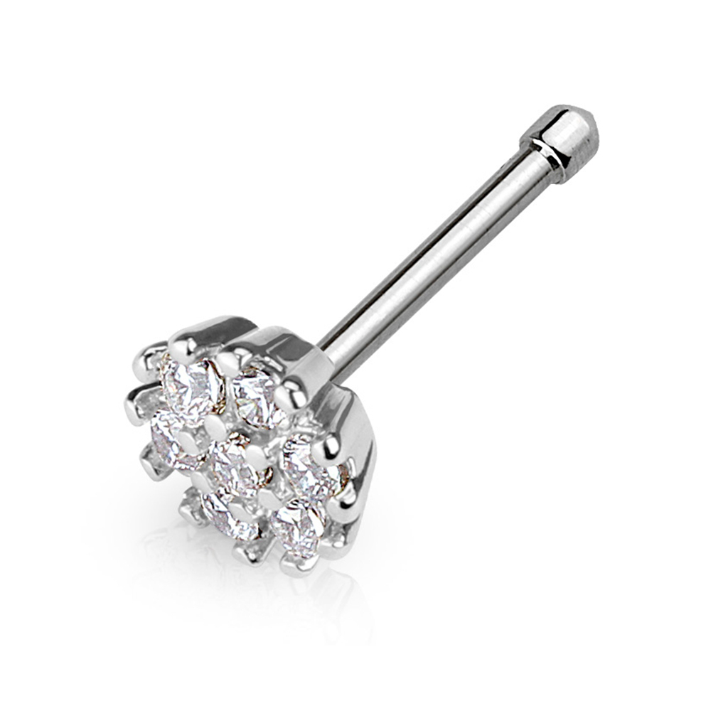 Tyčinka je vyrobena z chirurgické oceli, zatímco květina je z mosazi potažené lesklou rhodiovou vrstvičkou. Tyčinka je cca 8mm dlouhá a 0.8mm tlustá. Na opačném konci tyčinky je drobná kulička s průměrem 1mm. Tato kulička slouží k zabezpečení, že Vám piercing z nosu nevypadne.