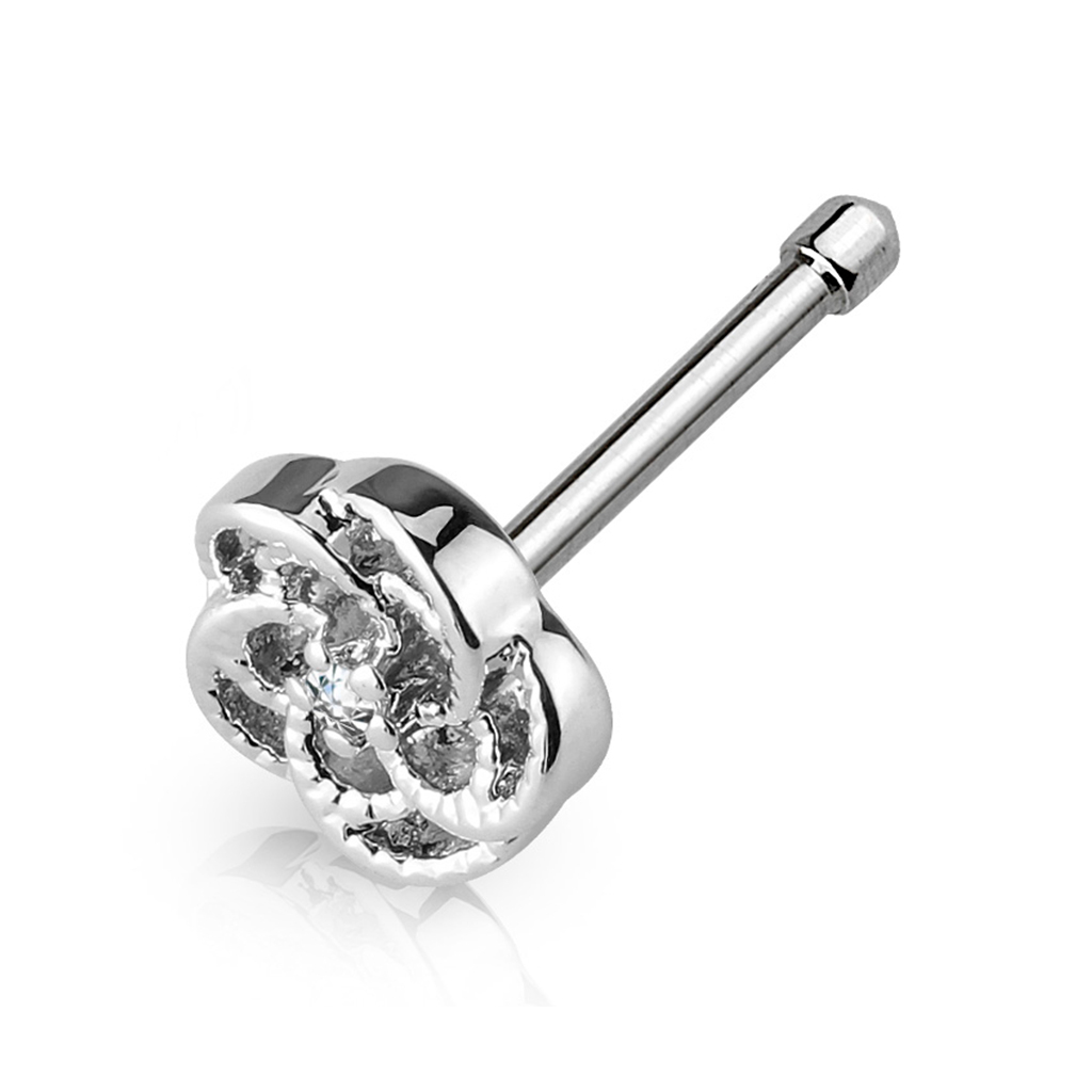 Tento roztomilý piercing do nosu je ozdoben krásnou růží. Růže má v sobě drobné výřezky, které pomáhají simulovat její okvětní lístky, a růže díky nim vypadá téměř jako socha. Uvnitř růže se nachází drobný čirý kamínek, který se skvěle hodí ke kamínkům, které zdobí zbytek růže. Růže má cca 6mm v průměru, a po nasazení na nos je tedy nepřehlédnutelná.