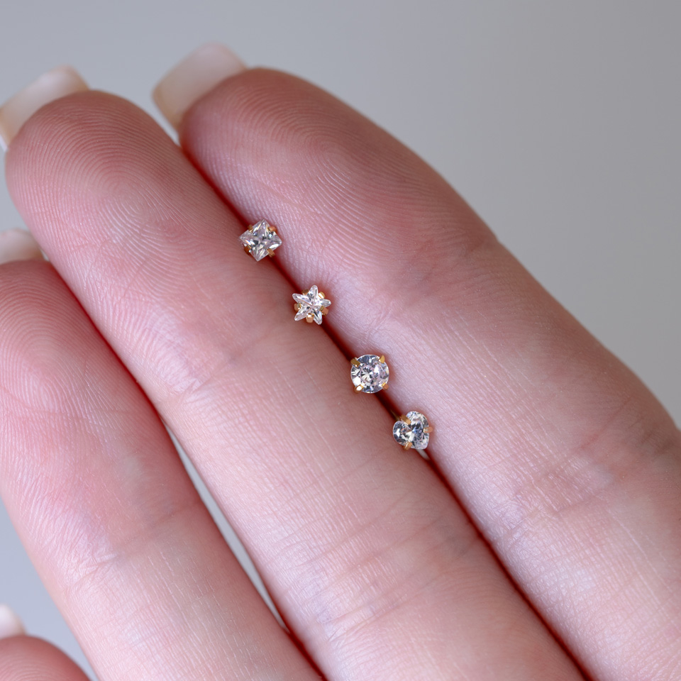 Piercing má tvar písmene "L", což umožňuje bezpečné nasazení bez rizika vyklouznutí. Tyčinka má ve všech modelech stejnou velikost: délku 6 mm a tloušťku 0,8 mm. Velikost zirkonového kamínku je mezi 2,5 mm a 3 mm (v závislosti na designu). Na závěr stojí za zmínku to, že jsou všechny modely vyrobeny z chirurgické oceli.
