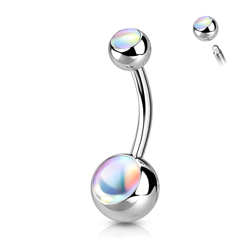 Tuto barvu znáte z mýdlových bublin nebo když vidíte olejovou skvrnu na vodě. Vysoce lesklý povrch, který mění barvu podle vašeho pohybu je fascinující na pohled. Totéž platí pro tento nádherný piercing do pupíku. Kamínek na horní i spodní kuličce mění barvu jako benzín na vodní hladině. Vzhledem k tomu, že obrázek, který máme k dispozici se nehýbe, nelze tento efekt dost dobře zobrazit. Je potřeba, abyste se na piercing podívali osobně a otočili ho ze strany na stranu. A až si tento piercing nasadíte do svého pupíku, bude tento efekt krásně viditelný při každém vašem pohybu.