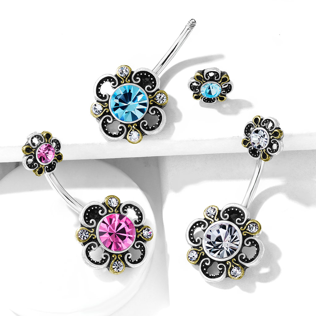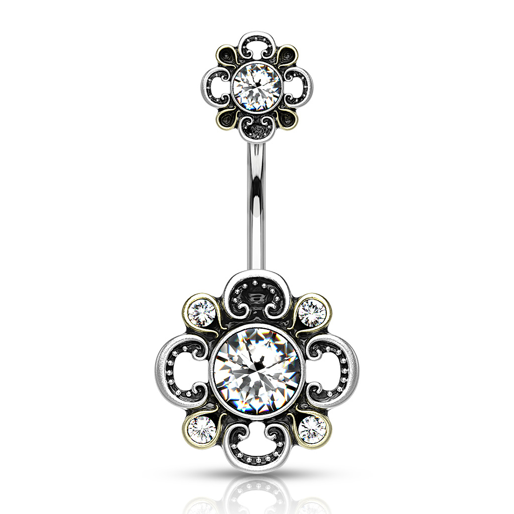 Název: Piercing do pupíku s filigránovou květinou a kamínky
