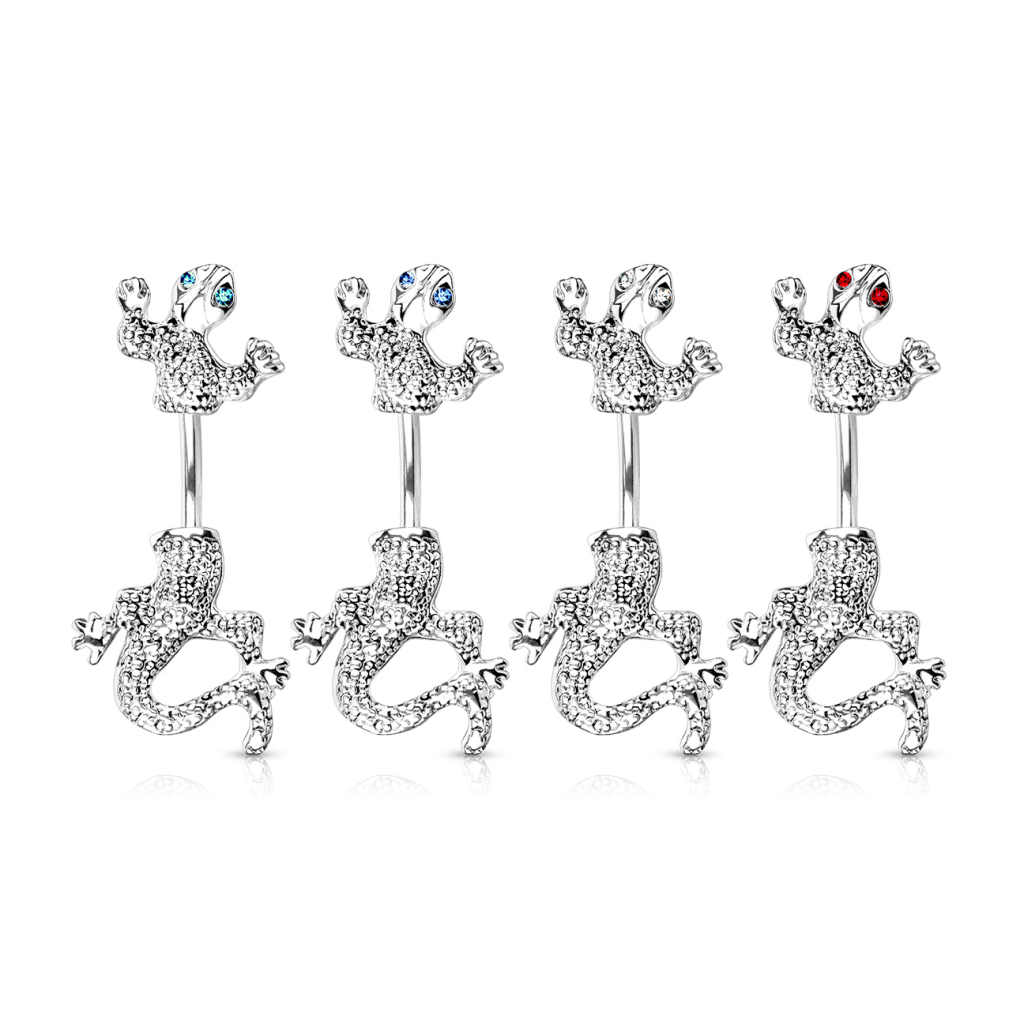 Máte vášeň pro netradiční šperky? Tento úžasný piercing do pupíku by pro Vás tedy mohl být jako dělaný! Je vyrobený z chirurgické oceli, a má tvar ještěrky. Horní část těla ještěrky tvoří horní kuličku zatímco spodní část těla ještěrky tvoří naopak spodní kuličku. To ale není vše, ještěrka je totiž dozdobena spoustou detailů, jako jsou prsty na jejích končetinách, či šupinatá kůže.