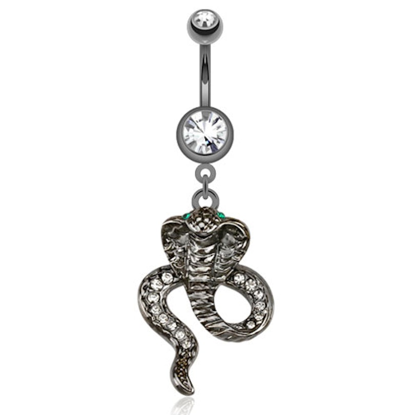 Sssss...syčí kobra, pohupující se na tomto piercingu. Tento krásný šperk má velmi autentický, hadí tvar, a v kombinaci s jeho precizními detaily Vám tedy dodá dojem, že se jedná o opravdovou kobru. Hlavička kobry je ozdobena tyrkysovými kamínky místo očí, a má úžasný 3D efekt, díky čemuž vypadá reálně i zezadu. Zbytek těla kobry je plochý, avšak zdobí ho spousta zářivých, čirých kamínků. Jedná se o opravdu prvotřídní kousek.