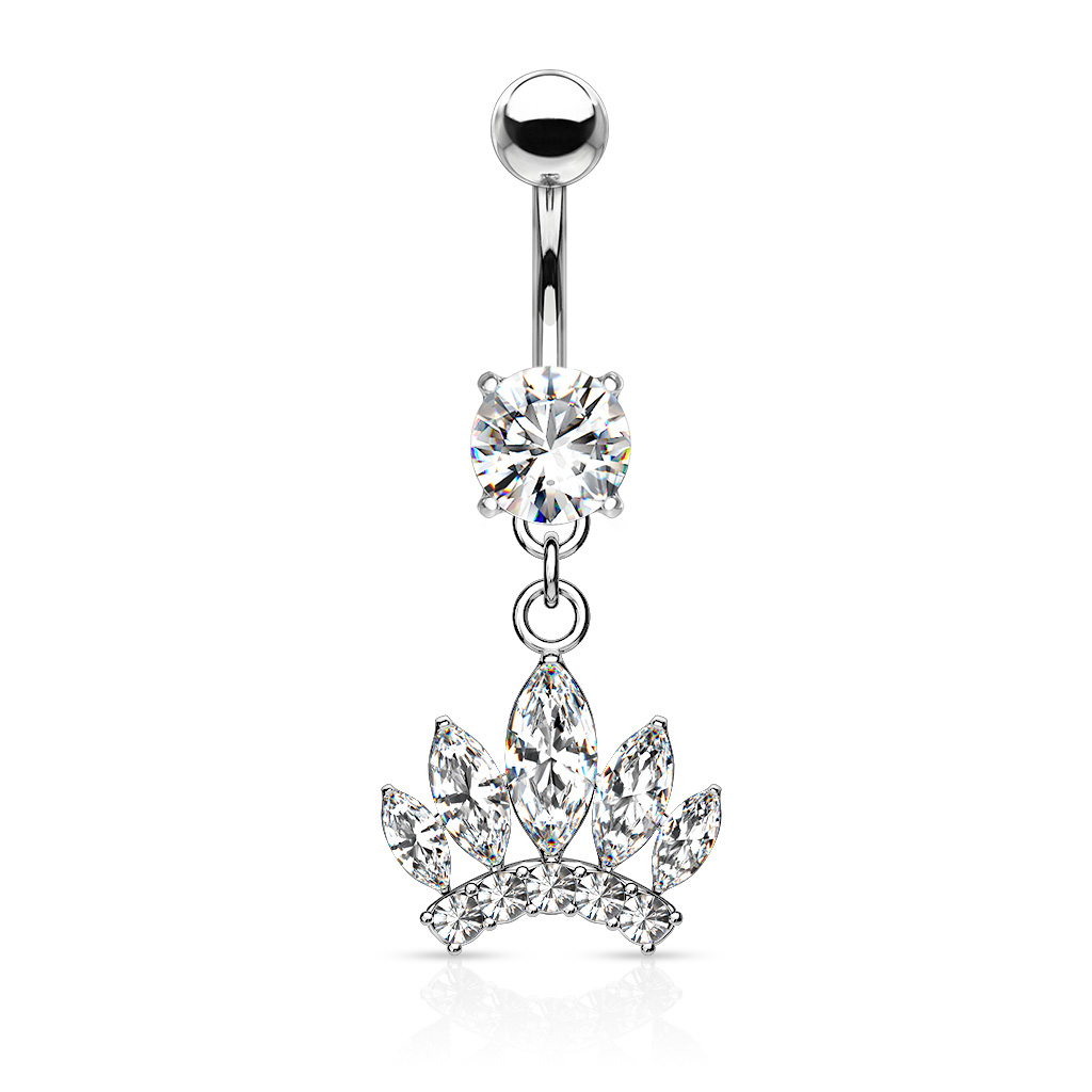 Staňte se na chvíli princeznou s tímto sladkým piercingem do pupíku s přívěškem ve formě královské korunky. Tato něžná korunka je přímo složená z kamínků - vrchní část korunky je tvořená pěti podlouhlými kamínky, které se uprostřed rozšiřují a na koncích zužují do špičky. Kromě těchto pěti kamínků je na spodu korunky také pás s dalšími, drobnými, kulatými kamínky.
