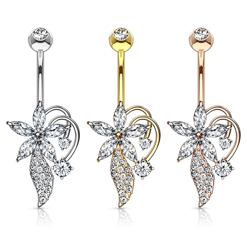Název: Piercing do pupíku s květinou zdobenou mnoha kamínky