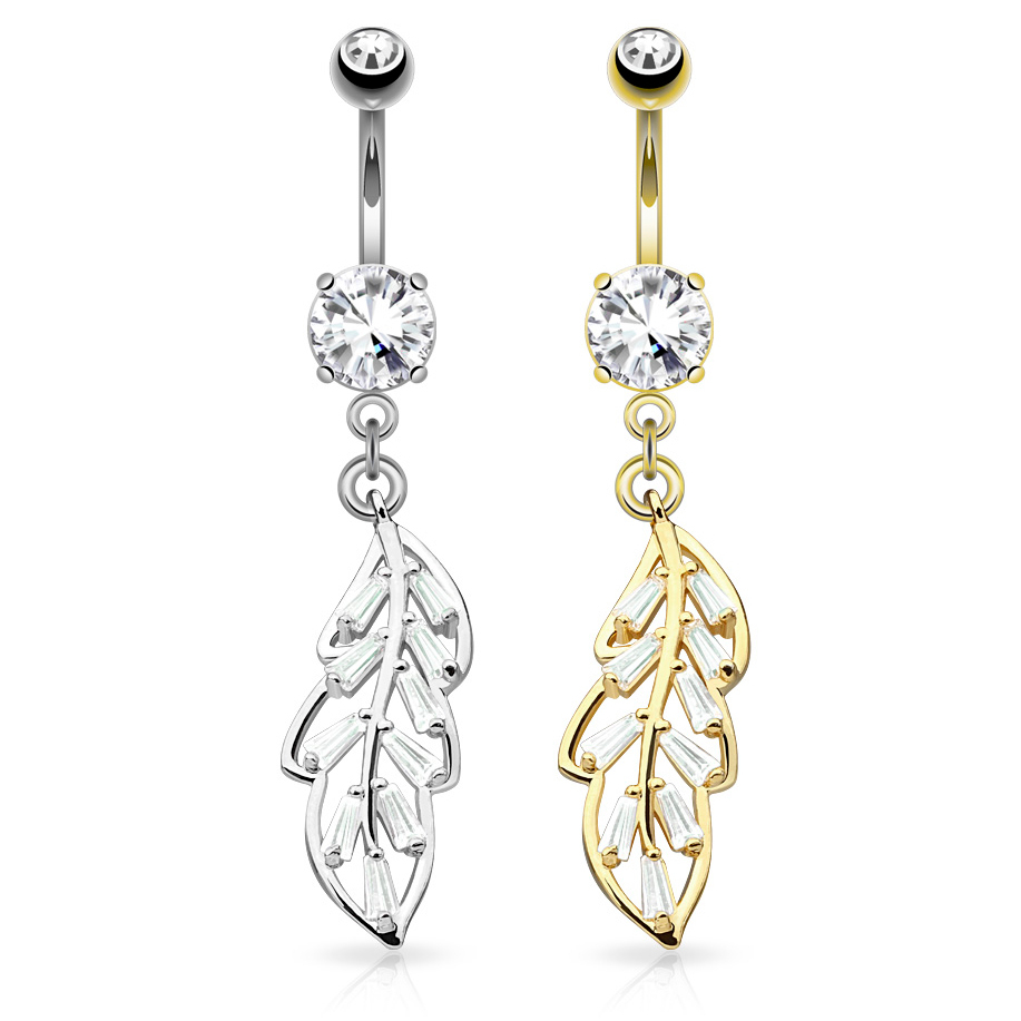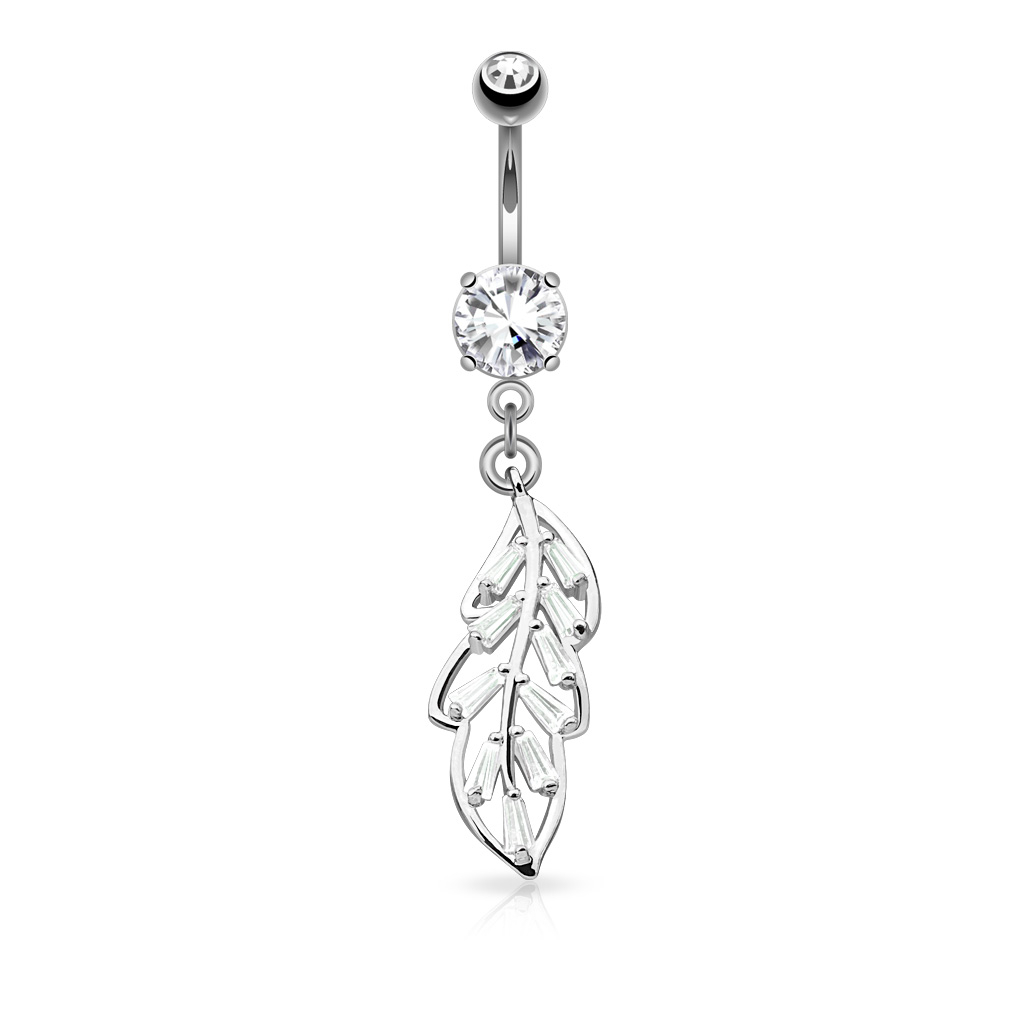 Mnohé z těch nejkrásnějších šperků na sobě mají přírodní motivy, nebo jsou přírodou inspirovány. Stejné platí i pro tento piercing do pupíku, který je ozdoben přívěškem s listem plným třpytivých kamínků. Lístek sám o sobě je velmi jednoduchý, avšak kamínky z něj dělají opravdový unikát, stejně tak jako zajímavá struktura lístku. Kamínky na jeho piercingových kuličkách šperku také dodávají eleganci.