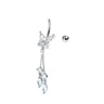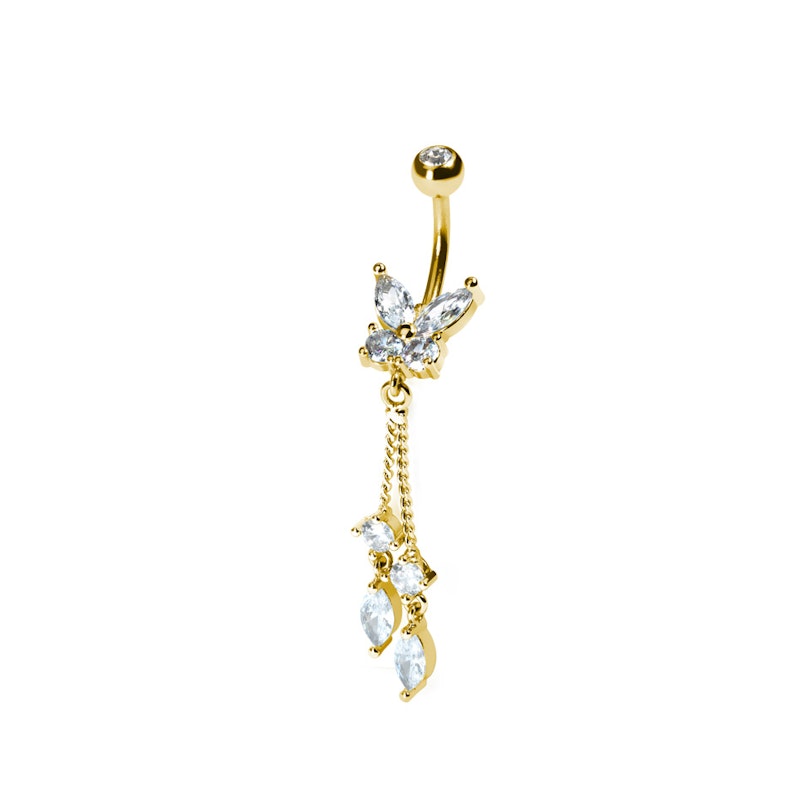 Tento třpytivý piercing do pupíku má na spodní kuličce krásného motýla s dalšími třpytivými kamínky na přívěscích, které z motýla visí díky jemným řetízkům.