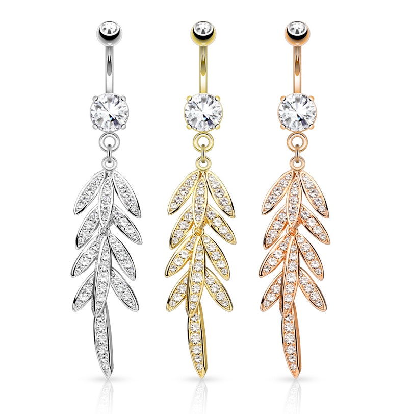 Představujeme Vám krásný a velice elegantní piercing do pupíku s přívěškem ve tvaru palmového listu. Palmový list je tvořen spoustou volně se pohybujících částí, které nejen, že budou krásně kopírovat každý Váš krok, ale také zářit díky úžasným kamínkům, kterými jsou ozdobeny. Celkem je na tomto palmovém listě 50 kamínků, které Vás tedy zajisté uhranou.