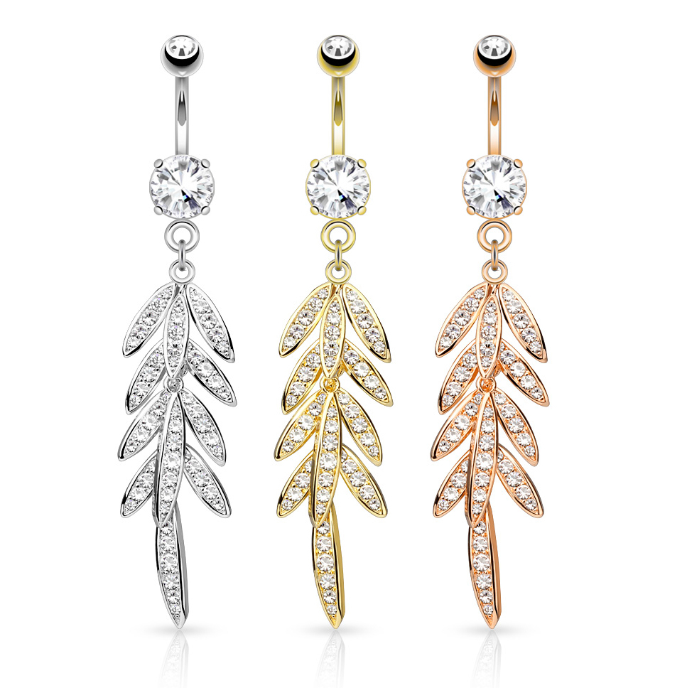 Představujeme Vám krásný a velice elegantní piercing do pupíku s přívěškem ve tvaru palmového listu. Palmový list je tvořen spoustou volně se pohybujících částí, které nejen, že budou krásně kopírovat každý Váš krok, ale také zářit díky úžasným kamínkům, kterými jsou ozdobeny. Celkem je na tomto palmovém listě 50 kamínků, které Vás tedy zajisté uhranou.