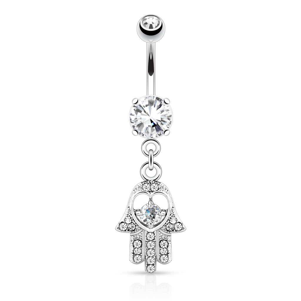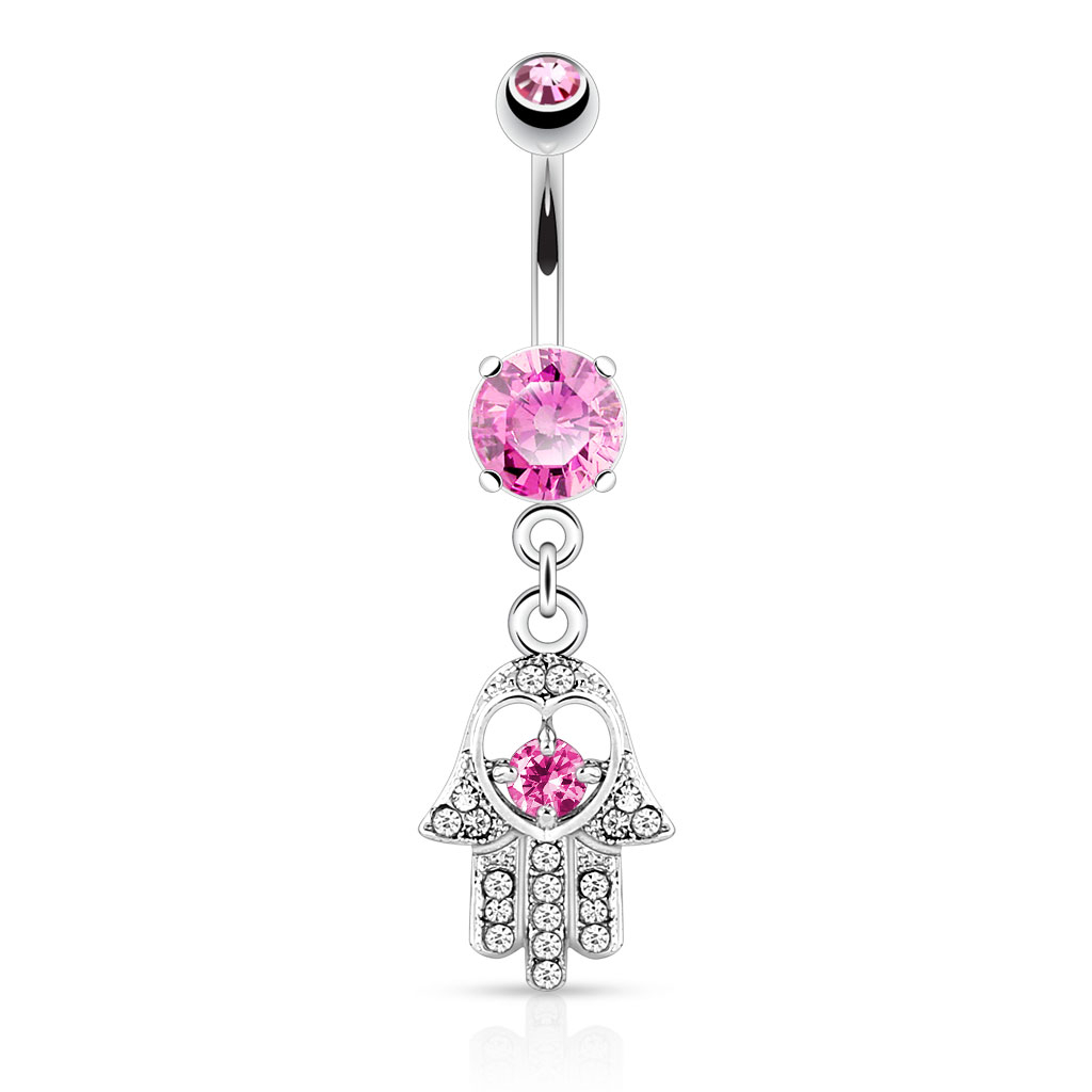 Představujeme Vám velmi speciální piercing do pupíku s rukou Fatimy na přívěšku. Ruka Fatimy je velmi starý symbol, který pochází ze západu, a který slouží jako ochranný amulet pro ty, kdo ho nosí u sebe. Z tohoto důvodu je ruka Fatimy velmi populárním motivem pro šperky.