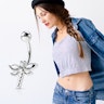 Představujeme Vám krásný piercing do pupíku ve tvaru vážky s pěti malými, čirými kamínky. Velikost tohoto šperku samozřejmě odpovídá mezinárodním standardním rozměrům, a jeho kontrukce z chirurgické oceli zaručuje bezpečné nošení i pro ty, kteří trpí alergiemi na nikl.