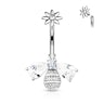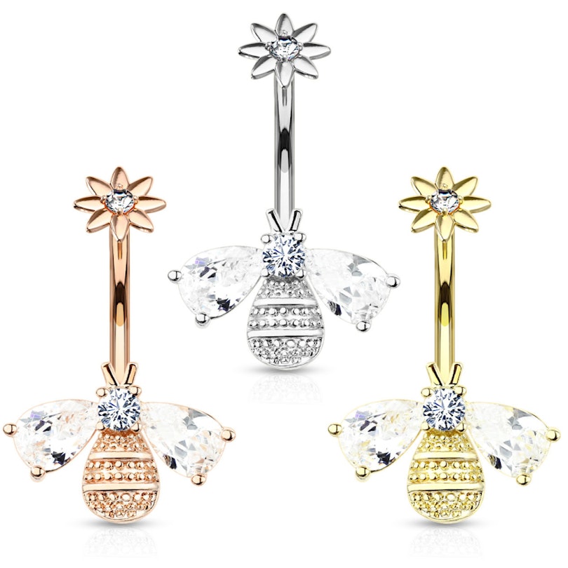 Piercing do pupíku nemusí nutně kombinovat horní kuličku s mírně větší spodní kuličkou. Může to být také, jako v tomto případě, kreativnější kousek s něčím navíc v designu. Horní kulička má nejen vnitřní závit, ale také šroubovací kuličku ve tvaru květiny s malým kamínkem uprostřed. Květina je zašroubovaná do zaoblené tyčinky o délce 10 mm. Na konci tyčinky je malá včelka se dvěma krásnými kamínkovými křídly. Hlavu včelky tvoří také kamínek a její tělo má hezké detaily, které včelce dodávají živější vzhled.