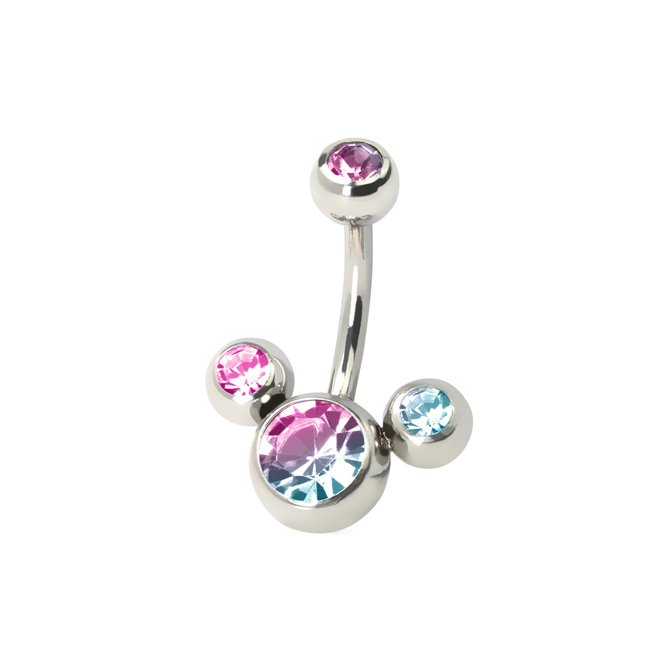 Výběr piercingu do pupíku je vždy zábava, jsou totiž k dispozici ve spoustě tvarů a barev, a piercing, který Vám teď představujeme je toho důkazem. Šperk má velmi známý tvar - nejspíš si hned na první pohled všimnete, že připomíná uši Mickeyho Mouse. Šperk je totiž poskládán kombinací stejných kruhů, jako je hlava Mickeyho.