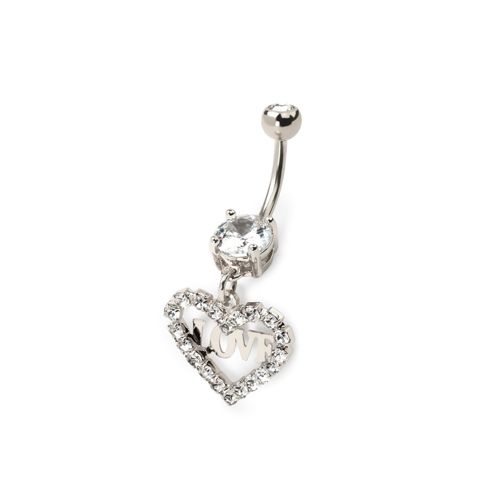 Piercing do pupíku se srdíčkem zdobeným kamínky a nápisem love