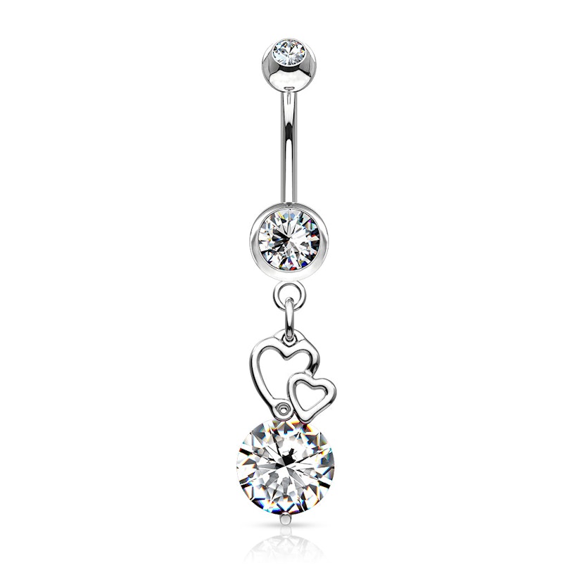 Pořiďte si tento nádherný piercing do pupíku se dvěma srdíčky a velkým krystalem. Tyčinka piercingu je vyrobena z chirurgické oceli, což je velmi bezpečný materiál, protože ze sebe nevypouští žádný nikl. Díky svým skvělým vlastnostem je tedy chirurgická ocel jedním z nejpoužívanějších materiálů pro výrobu piercingů.