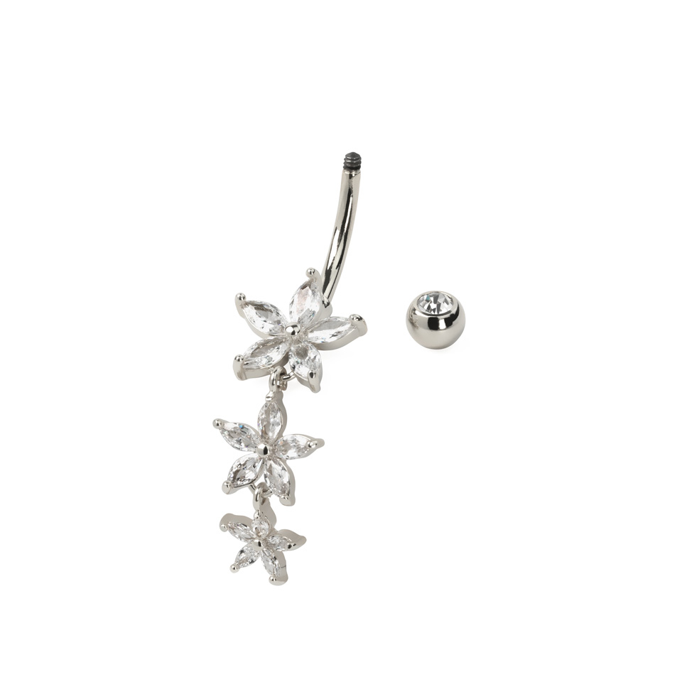 Tento piercing do pupíku má vše, co byste jen mohli chtít - kamínky i květiny. Kamínky jsou s květinami krásně zkombinované tak, že kamínky tvoří okvětní lístky květin. Celkem se na piercingu nachází tři květiny s pěti okvětními lístky. Horní květina je největší, a zbytek se postupně zmenšuje. Horní květina je navíc napevno uchycená na spodní kuličce piercingu, zatímco dvě další květiny jsou na ní zavěšeny,