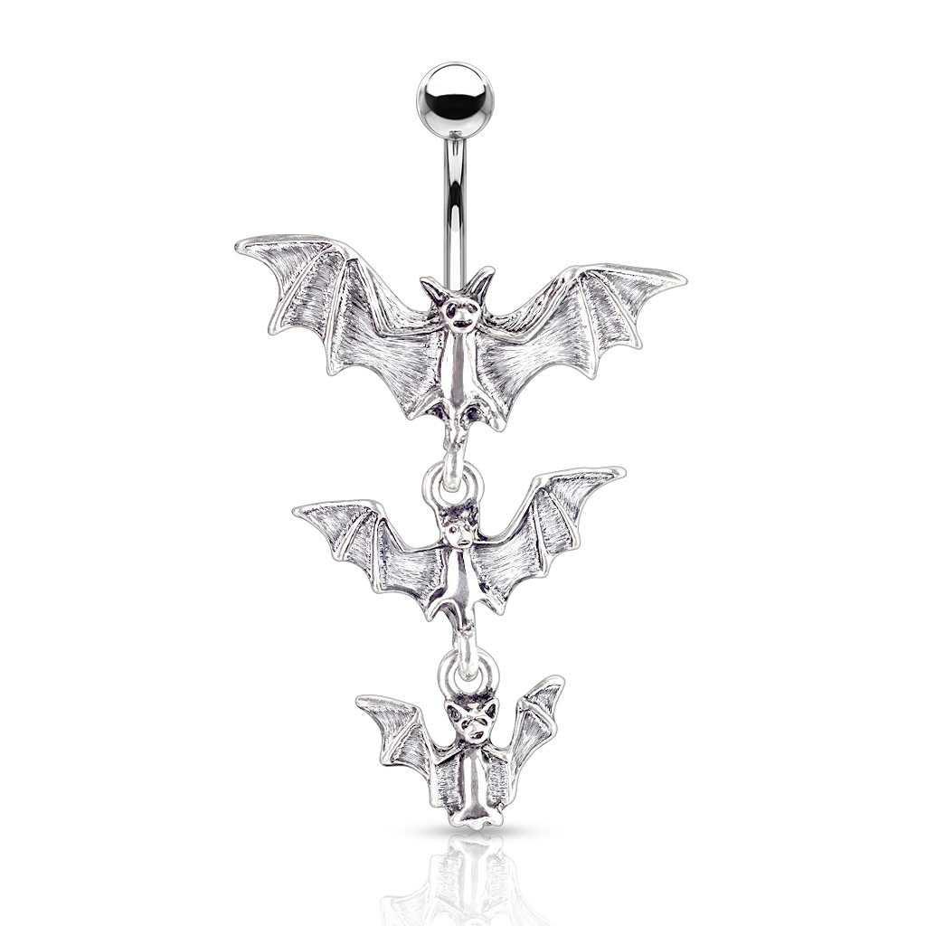 Tento piercing je vyroben z chirurgické oceli. Přívěšek byl chemicky ošetřen, aby dostal načernalý, vintage nádech. Tři netopýři jsou na něm zavěšeni podle velikosti, největší je nahoře a nejmenší se pohupuje naspod. Největší netopýr zároveň slouží jako spodní kulička piercingu, zatímco ostatní dva se houpou navolno, a budou kopírovat Váš pohyb při každém kroku.