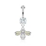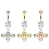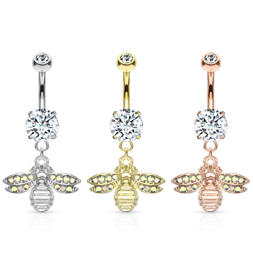 Piercing do pupíku, který můžete vidět na obrázku, je ozdoben roztomilou malou včelkou. Včelka je vyrobená z mosazi, a její křídla jsou ozdobená drobnými kamínky, které hrají snad všemi barvami duhy. Těmto kamínkům říkáme aurora borealis, protože připomínají polární záři.