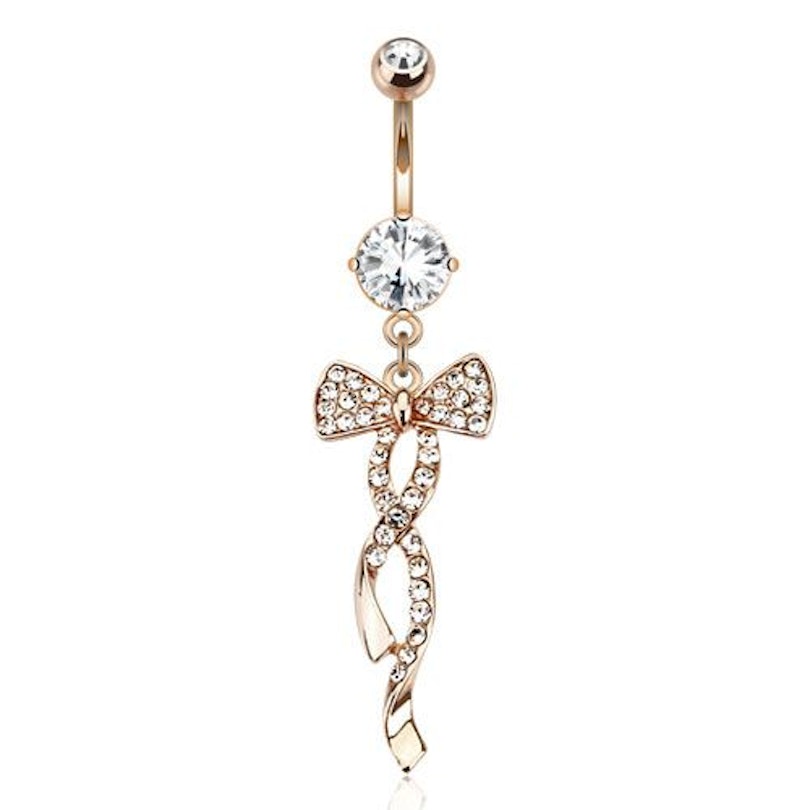 Piercing do pupíku v barvě červeného zlata s mašlí a kamínky
