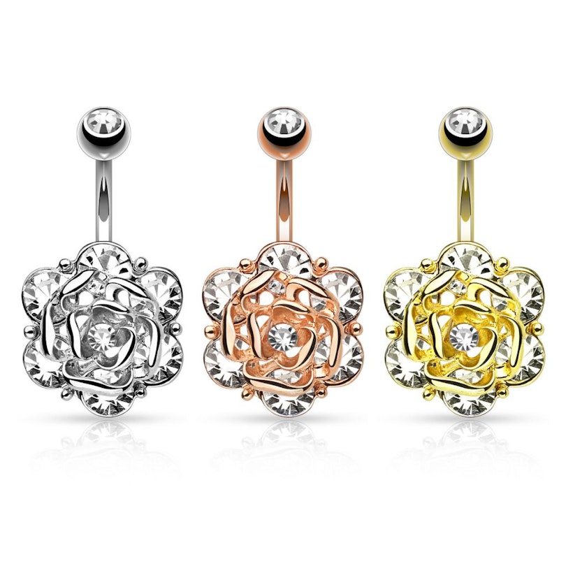 Pokud hledáte šperk se spoustou kamínků, dál už hledat nemusíte. Nabízíme Vám piercing do pupíku s impozantní květinou, která se bude krásně třpytit ať si ji vezmete kamkoliv.