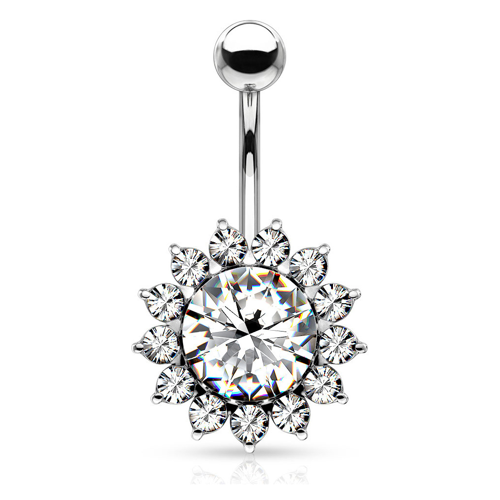 Tento piercing do pupíku je ozdoben krásným kamínkem uprostřed, který je o dost větší než jiné podobné kamínky. Když se ho dotkne světlo, krásně se díky němu šperk rozzáří. Okolo kamínku jsou i další, menší kamínky, které velký kamínek krásně rámují. Kamínky navíc reprezentují okvětní lístky slunečnice, kterou díky nim šperk připomíná. Když se na tento šperk podíváte jako na celek, slunečnici v něm určitě uvidíte.