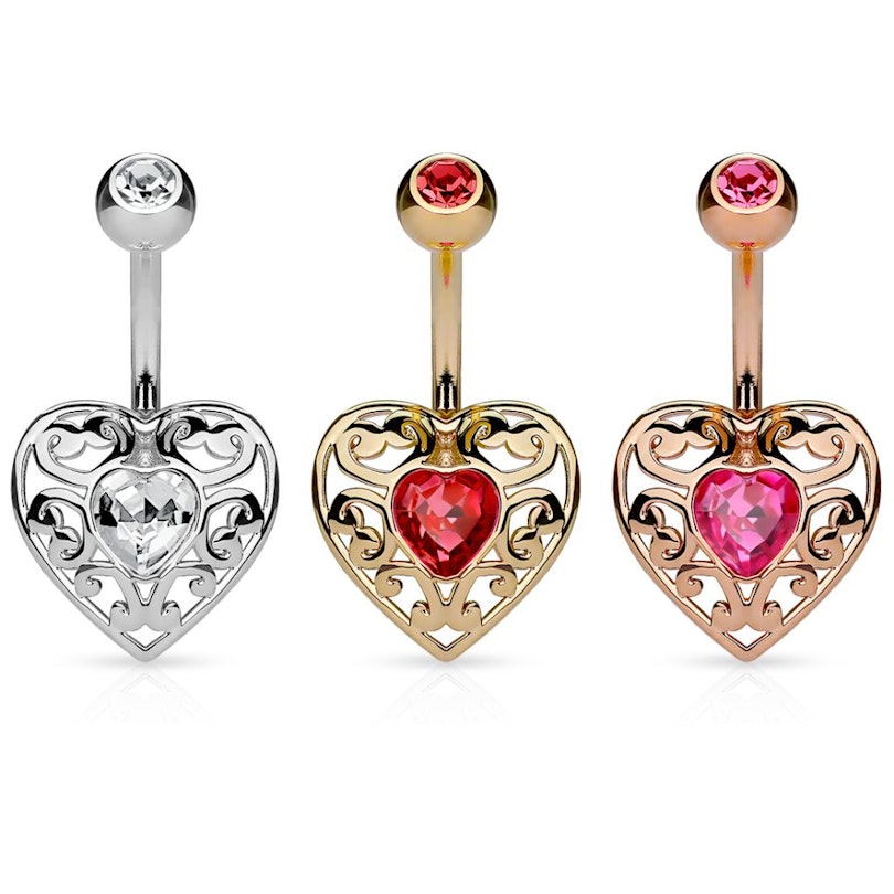 Na spodním konci tyčinky z chirurické oceli se nachází srdce z mosazi. Srdce je ozdobeno různými drobnými filigránovými výřezy, což mu dodává velmi elegantní a zajímavý efekt. Uprostřed je srdce ozdobené kamínkem, taktéž ve tvaru srdce, který je k dispozici v několika různých barvách. Barva srdcového kamínku bude záviset na barvě konstrukce piercingu. Zvolíte-li si piercing ve stříbrné barvě, srdce bude čiré, se zlatou barvou piercingu dostanete srdce červené, a s růžovo-zlatým piercingem dostanete růžové srdce.