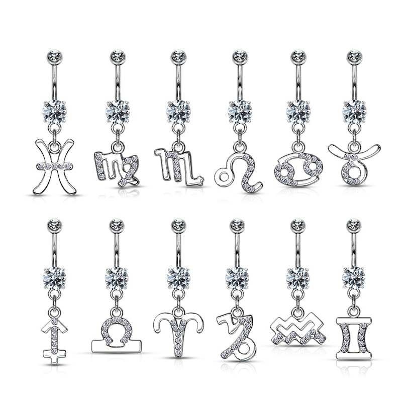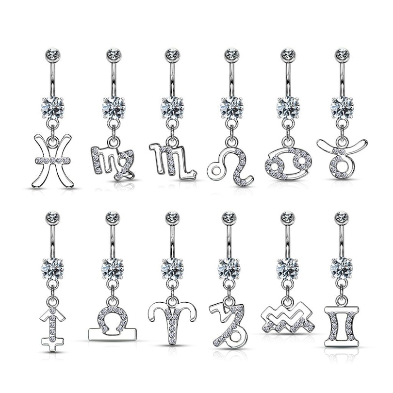 Představujeme Vám skvělý piercing do pupíku se znamením zvěrokruhu. Svoje znamení, či znamení osoby, které chcete tento šperk darovat, si můžete vybrat vedle obrázku. Ať už si vyberete kterékoliv znamení, můžete se spolehnout, že bude krásně ozdobeno drobnými, čirými kamínky. Horní kulička a tyčinka piercingu jsou vyrobeny z chirurgické oceli, a jsou tedy bezpečné i pro ty, kdo mají alergii na nikl, chirurgická ocel totiž žádný nikl neobsahuje. Chcete-li zachovat krásu tohoto piercingu po dlouhou dobu, nezapomeňte si ho sundat, kdykoliv hrajete sport, nadměrně se potíte, sprchujete se či se koupete. Pokud toto dodržíte, bude Váš šperk vypadat stále jako nový. Nejste-li si jisti, který symbol si vybrat, tady jsou data narození odpovídající jednotlivým znamením: