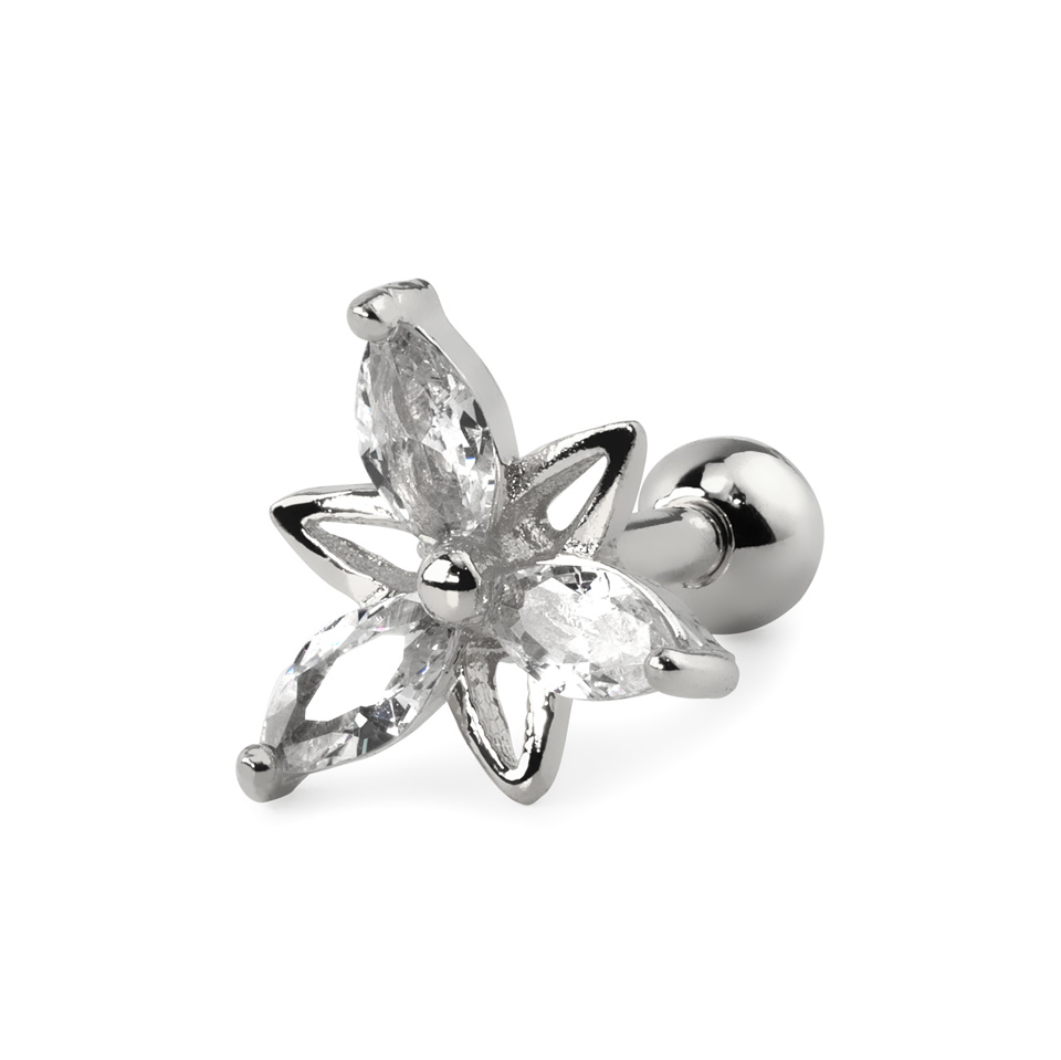 To, co vám na první pohled připomíná točítko fidget spinner, je vlastně květina se třemi jasnými lístky na tyčince z chirurgické oceli. Šperk je určený pro piercing do uší, jako je ušní lalůček, helix nebo tragus. Můžete ho ale využít také v jiných částech těla. Pouze se ujistěte, že rozměry tyčinky odpovídají vašemu piercingu a že anatomicky bude sedět. Například piercing ve rtu není dobrý nápad, protože by vám v puse překážela koncová kulička. Kulička se závitem má průměr 3 mm. Tyčinka má délku 6 mm a průměr 1,2 mm. Tyčinka je vyrobená z chirurgické oceli a struktura květiny je zhotovená z mosazi. Oba kovy jsou podle zvoleného modelu buď potažené rhodiem, nebo 14 karátovým zlatem.