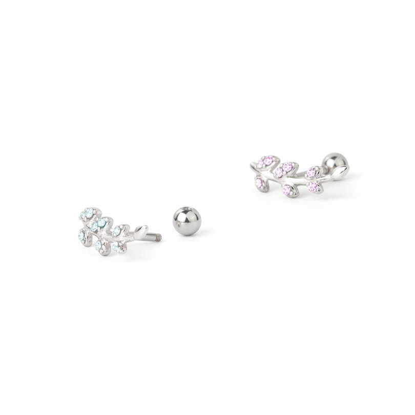 Tento šperk má tyčinku o tloušťce 1,2 mm a designově je tvarován jako větvička, která se lehce zohýbá do strany. Větvička má lístky po obou stranách, a každý z lístků zdobí kamínek, který si můžete zvolit ve třech různých barvách. Je Vám k dispozici čirá, tyrkysová nebo růžová barva.