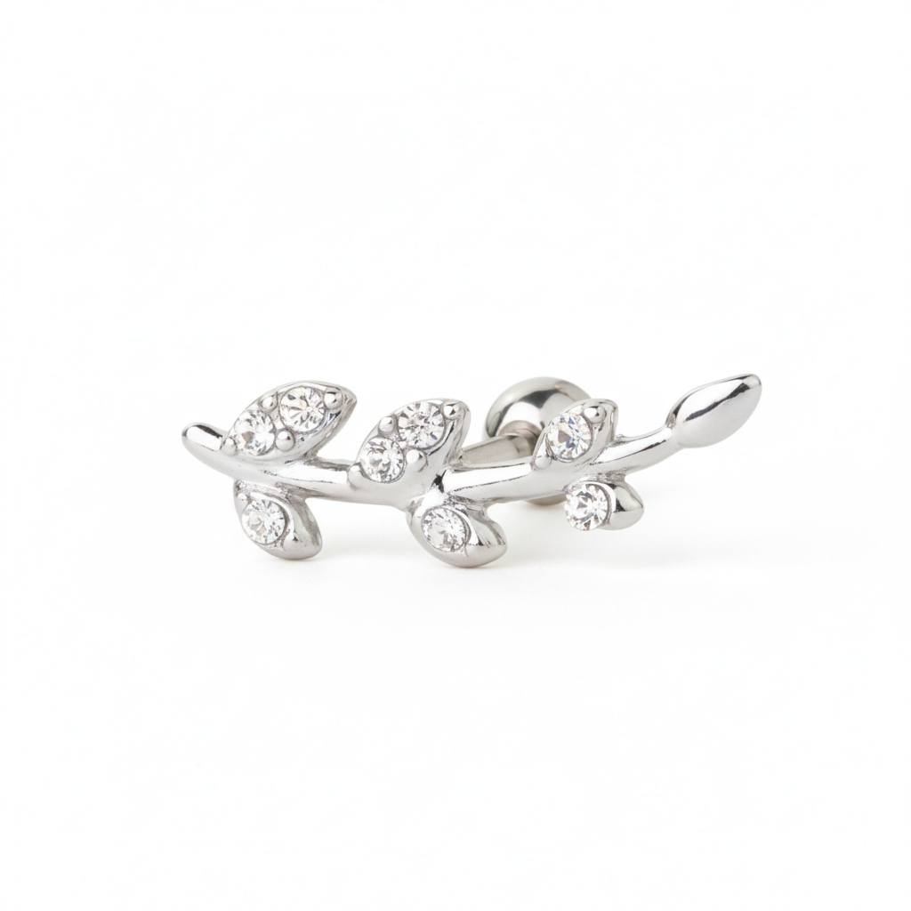 Tento šperk má tyčinku o tloušťce 1,2 mm a designově je tvarován jako větvička, která se lehce zohýbá do strany. Větvička má lístky po obou stranách, a každý z lístků zdobí kamínek, který si můžete zvolit ve třech různých barvách. Je Vám k dispozici čirá, tyrkysová nebo růžová barva.