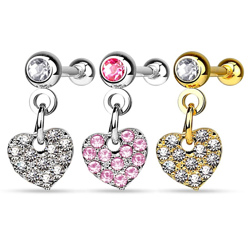 Piercing do ucha s přívěskem ve tvaru srdce zdobeným kamínky