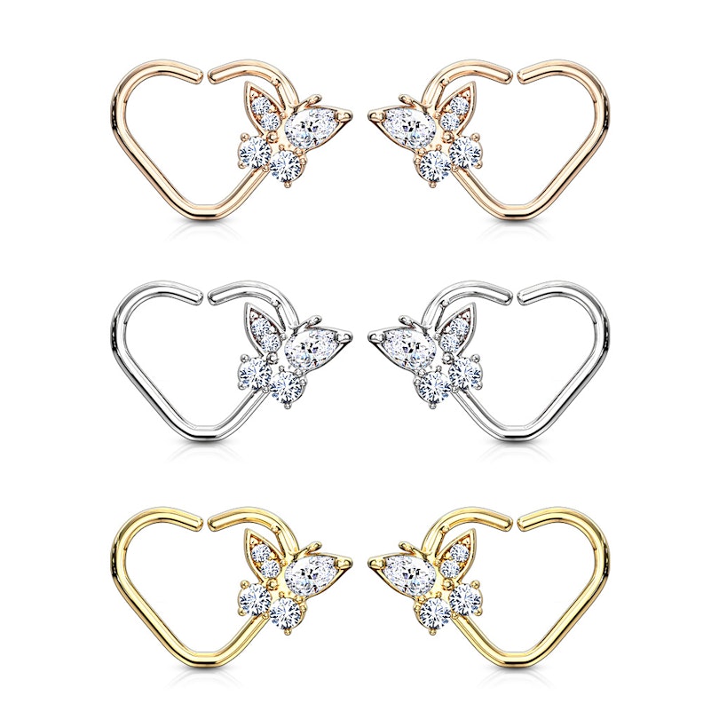 Piercing do ucha ve tvaru srdce s motýlem z kamínků