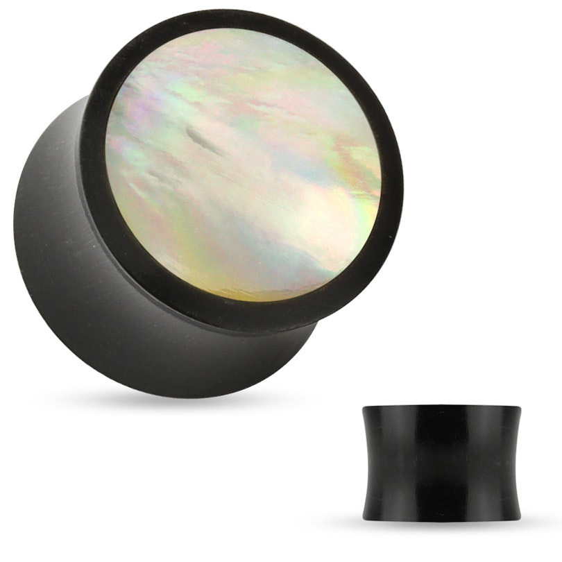 Na přední straně plugu je malá, barevná, třpytivá, kulatá destička, která je také vyrobena z organického materiálu, tentokrát z perleti. Tato hra barev dodává šperku mimořádný nádech. Černá barva základny nádherně zdůrazňuje vzhled perleti.
