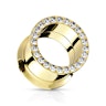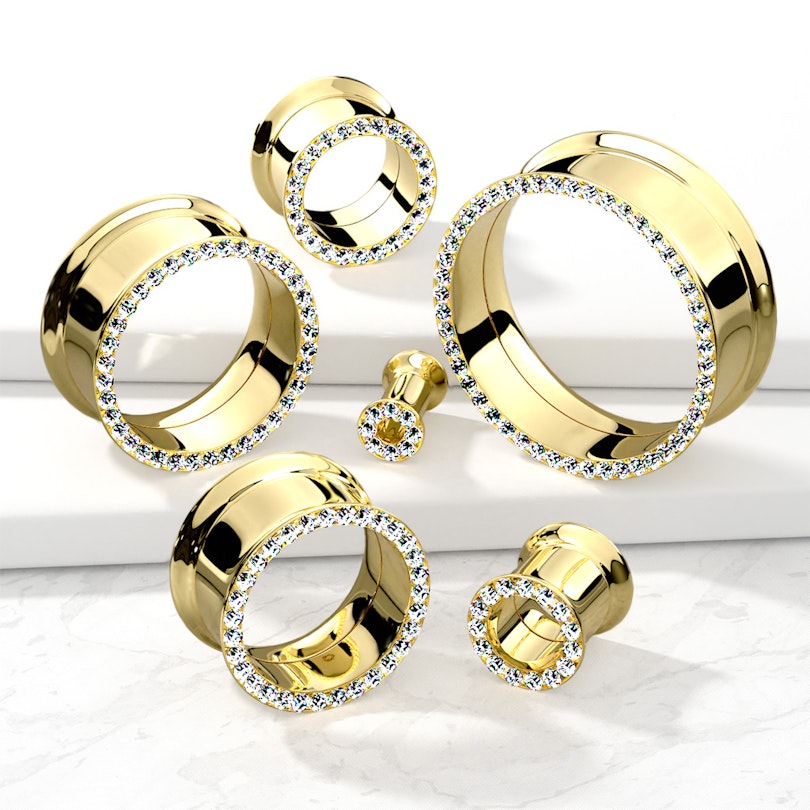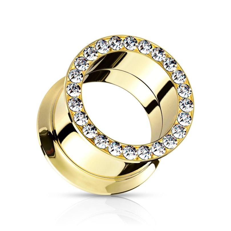 Tento tunel je vyroben z pozlacené chirurgické oceli s okrajem zdobeným malými čirými kamínky.