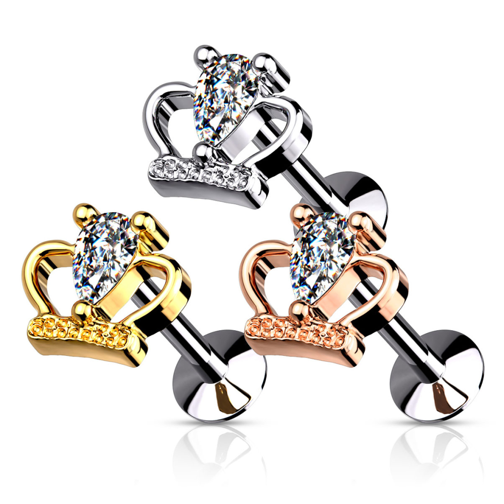 Tato labreta je krásně ozdobená roztomilou korunkou, která má uprostřed krásný čirý kamínek ve tvaru slzy. Korunka je k dispozici v několika barevných provedeních. Všechna provedení však mají stejně dlouhou i tlustou tyčinku, a stejnou barvu kamínku, který ji zdobí. Zezadu korunky je drobný špendlík, který se při nasazování šperku zasune do