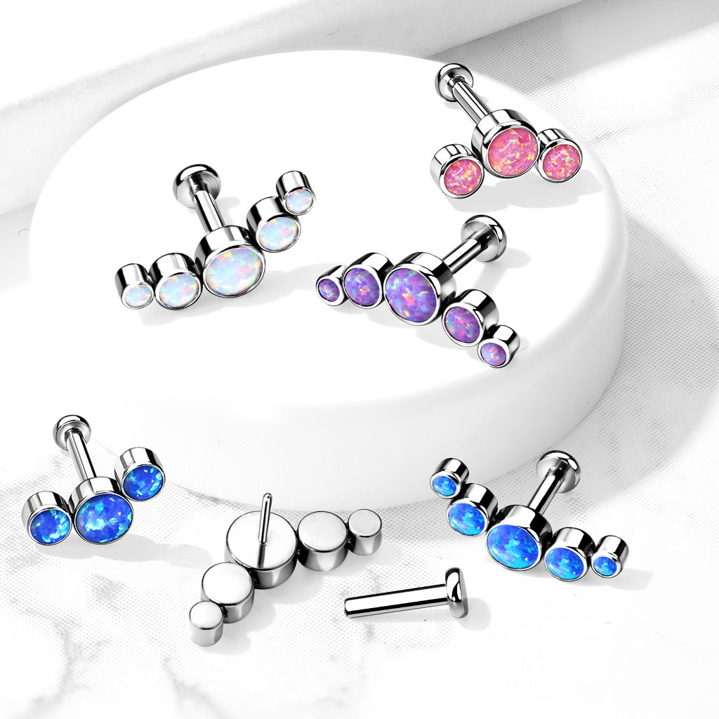 Šperk je v nabídce ve dvou různých provedeních. Můžete si vybrat jestli váš nový piercing bude zdobený 3 nebo 5 kamínky. A samozřejmě máte na výběr také z několika barevných kombinací. Opály se liší svou velikostí. U modelu, který je zdobený 3 kamínky je jejich velikost 2,9 mm a 3,8 mm. U modelu s 5 kamínky mají velkosti 1,9 mm, 3 mm a 4 mm.