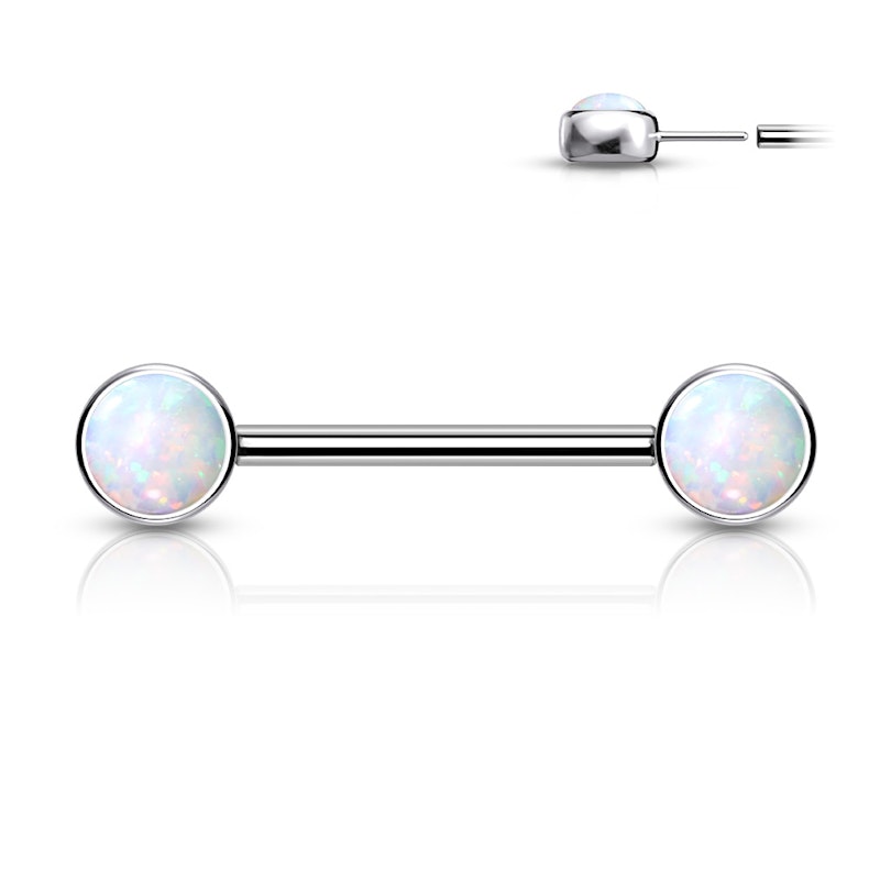 Celý šperk je vyroben z titanu. Tyčinka je 14 mm dlouhá, takže bude pasovat do většiny piercingů do bradavky. Kuličky mají v průměru 6 mm, mají ploché záda, takže leží rovně v závislosti na vaší bradavce. Opály nejsou pravé, jedná se o imitaci. Jsou vsazené, takže nebylo použito žádné lepidlo. Navíc si můžete vybrat z různých barev.