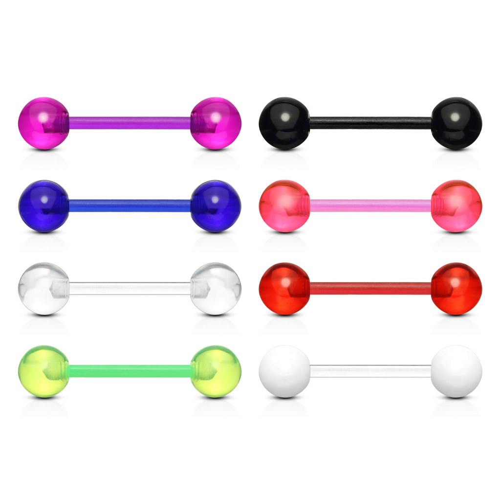 Pořiďte si těchto 8 piercingů do jazyka v barvách jako vidíte na obrázku. Délka jejich tyčinek je 16mm, ale díky výrobě z PTFE se dá lehce zkrátit. Jediné, co budete ke zkrácení potřebovat jsou nůžky a kovová piercingová kulička, se kterou do nového konce tyčinky vytlačíte závity.