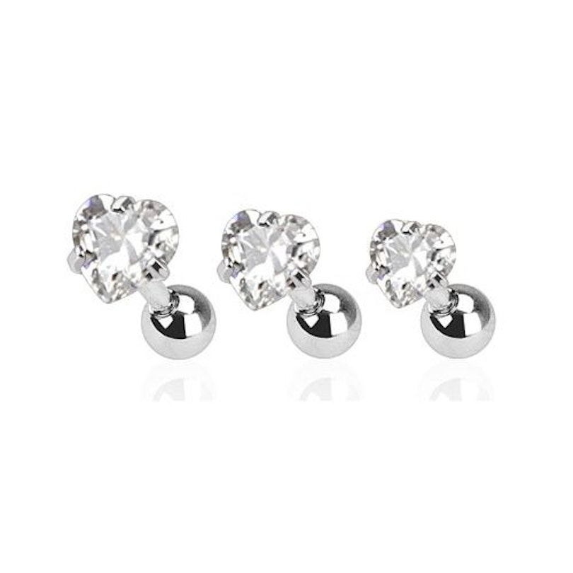 Tuto sadu tří piercingů do ucha můžete nosit téměř ve všech piercingových dírkách, zejména v těch, které byly nastřeleny. Tato sada obsahuje tři identické náušnice, které se od sebe liší jen velikostí. Všechny mají krásnou ozdobu z kamínku, který nemá jen obyčejný kulatý tvar, ale je srdcovitý. Piercingy jsou ve velikostech cca 3, 4 a 5 mm. Tyto velikosti nejsou úplně přesné, protože je těžké určit průměr u nepravidelného tvaru, jako je srdce.