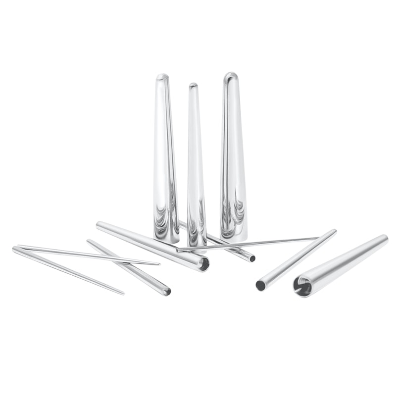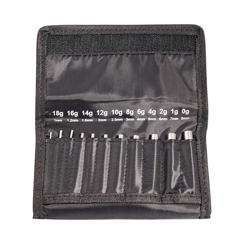 Obě sady mají společné to, že roztahováky mají na svém nejširším konci prohlubeň, která odpovídá velikosti šperku, který budete chtít nosit. To znamená že roztahovák o průměru 10 mm má konec široký 11 mm, takže vám dovolí jednoduše vsunout šperk o průměru 10 mm.