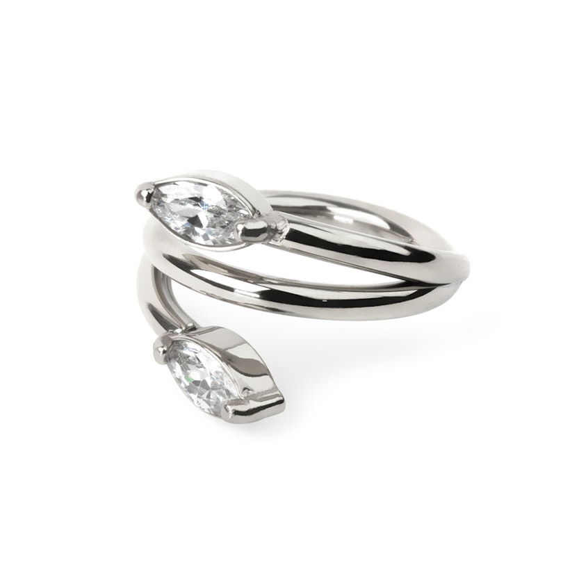 Jemný kroužek z chirurgické oceli, který je zdobený dvěma čirými zirkony v markýzovém brusu. Ty vytvářejí vzhled listů vinné révy. Jedná se o univerzální šperk, který je k dispozici v průměru 8 mm a 10 mm a ve zlatém nebo stříbrném barevném provedení. Díky tomu se krásně hodí pro všechny typy piercingů v uchu, zejména k piercingu chrupavky jako je třeba rook a helix.