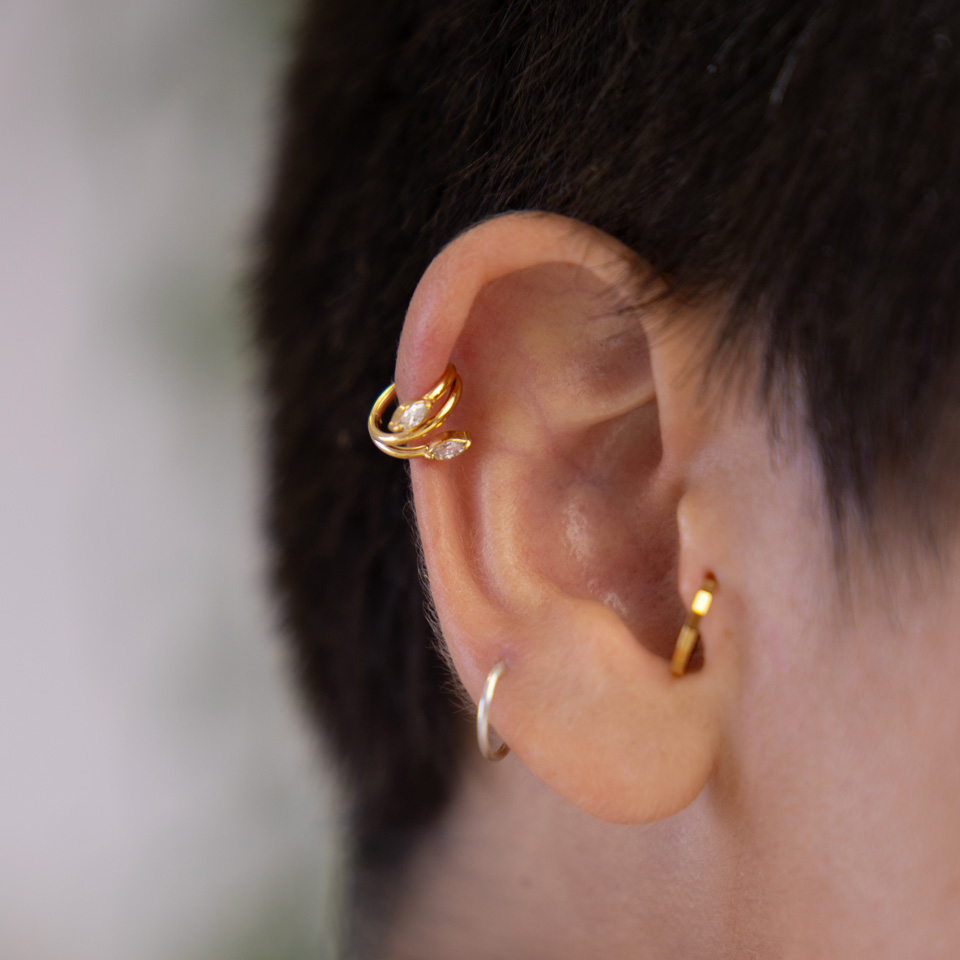 Jemný kroužek z chirurgické oceli, který je zdobený dvěma čirými zirkony v markýzovém brusu. Ty vytvářejí vzhled listů vinné révy. Jedná se o univerzální šperk, který je k dispozici v průměru 8 mm a 10 mm a ve zlatém nebo stříbrném barevném provedení. Díky tomu se krásně hodí pro všechny typy piercingů v uchu, zejména k piercingu chrupavky jako je třeba rook a helix.