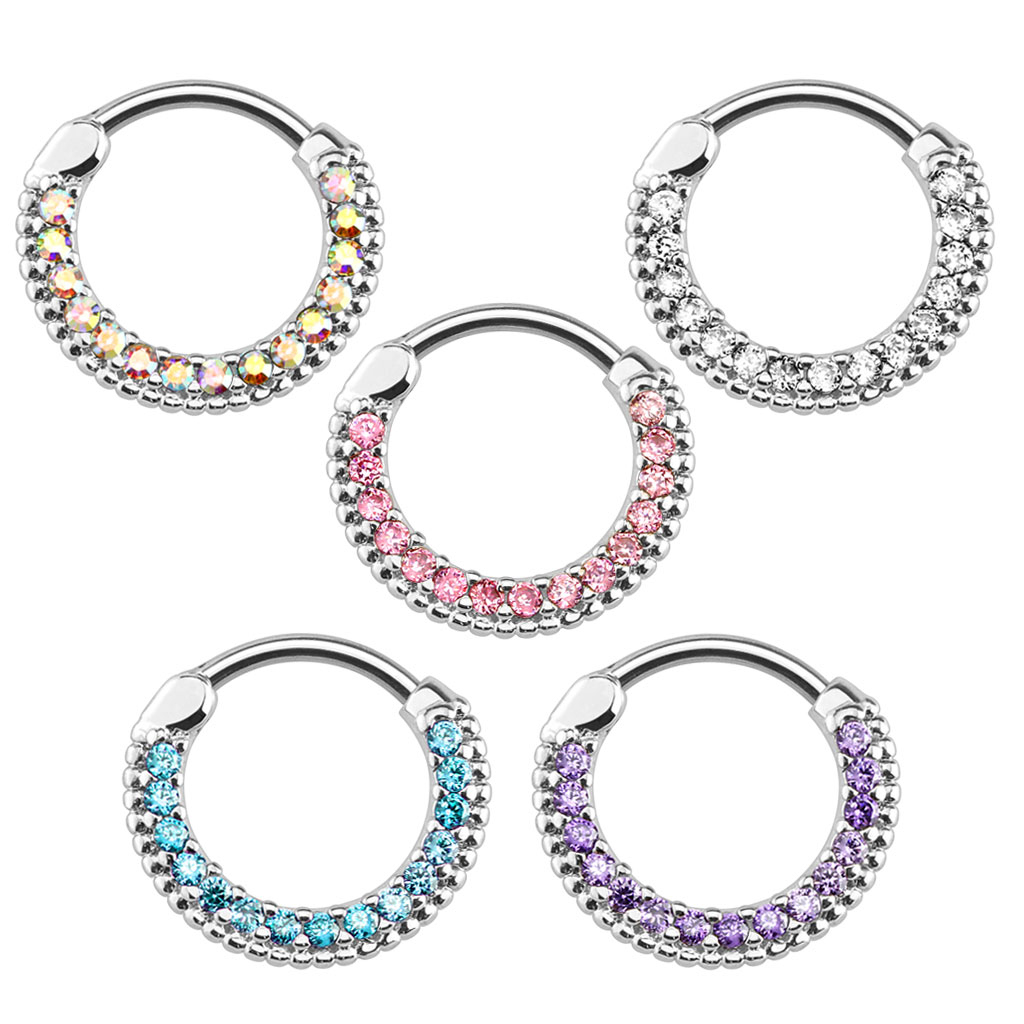 Kroužek je posetý kamínky v pěti různých barvách. Kamínky jsou poskládané až k otevíracímu kloubu; jak jej jednou nasadíte do vašeho septumu, uvidíte jen je a jejich nádhernou hru barev. Ať už si vyberete jakoukoliv barvu, všechny mají na okrajích řadu teček a to jak nahoře, tak i dole. Design tohoto septum clickeru je elegantní a pečlivě detailní.