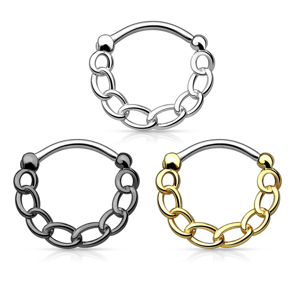 Jedná se o kroužek, jehož ozdobná část připomíná řetěz. Tento šperk je tedy svým vzhledem od klasických, roztomilých šperků s kamínky velmi daleko. Řetěz je pevný a drží svůj oblý tvar, a nebude se Vám tedy pod nosem pohupovat.