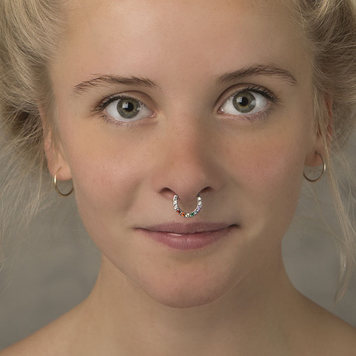 Jestli hledáte pro svůj septum nový špek, který je elegantní a krásný, jste na správném místě. Tento úchvatný kroužek má klasický design, který vám dovolí nosit jej každý den. Má tvar dokonalého kruhu s okraji, které jsou zdobené krásnými kamínky, které vás oslní.